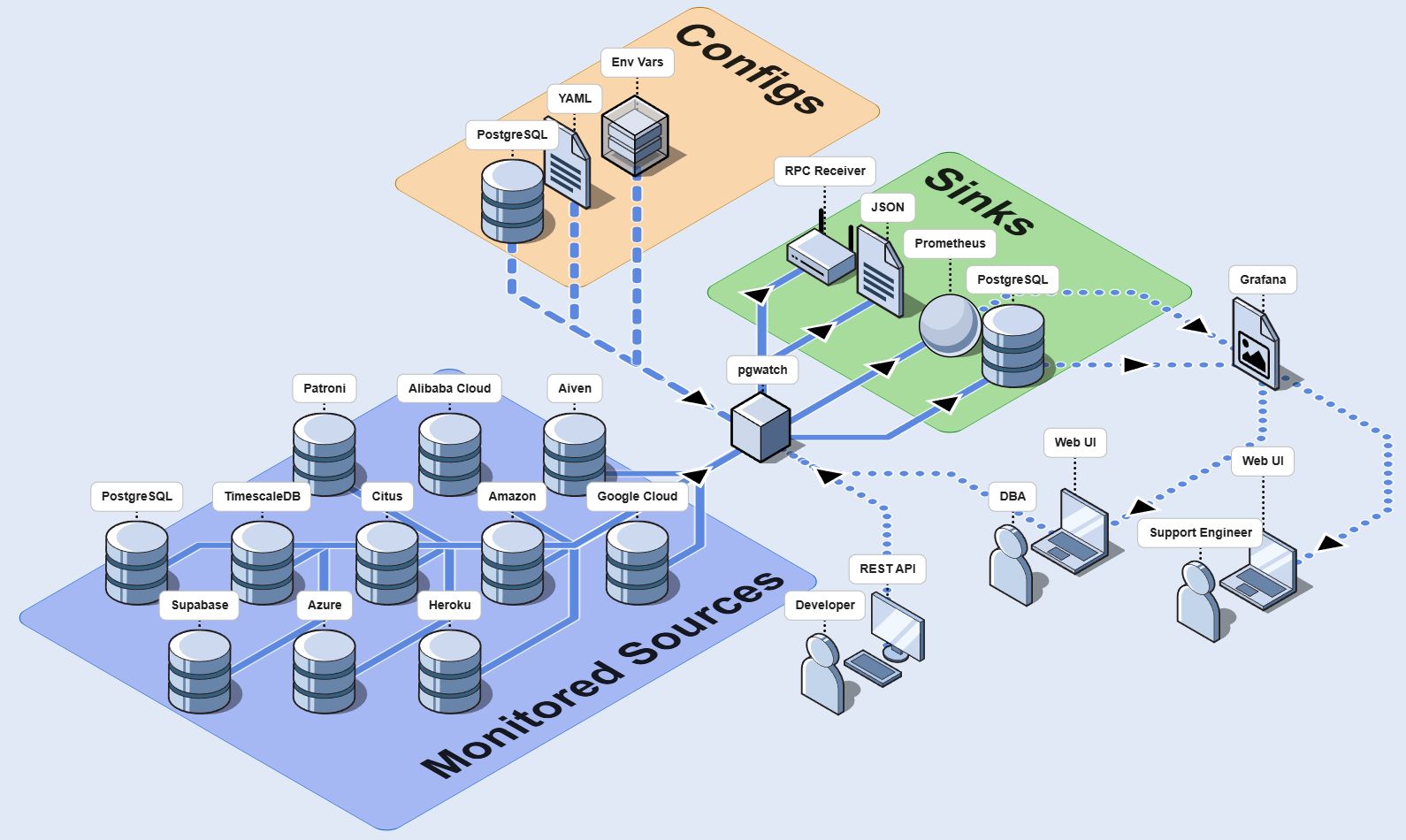 pgwatch permet aussi de récupérer les statistiques des outils tels que PgBouncer, Patroni, Pgpool-II, Prometheus, de parser les logs de PostgreSQL, ou de récupérer des statistiques depuis des services managés de PostreSQL chez divers fournisseurs de solution cloud (AWS, Azure, GCP).